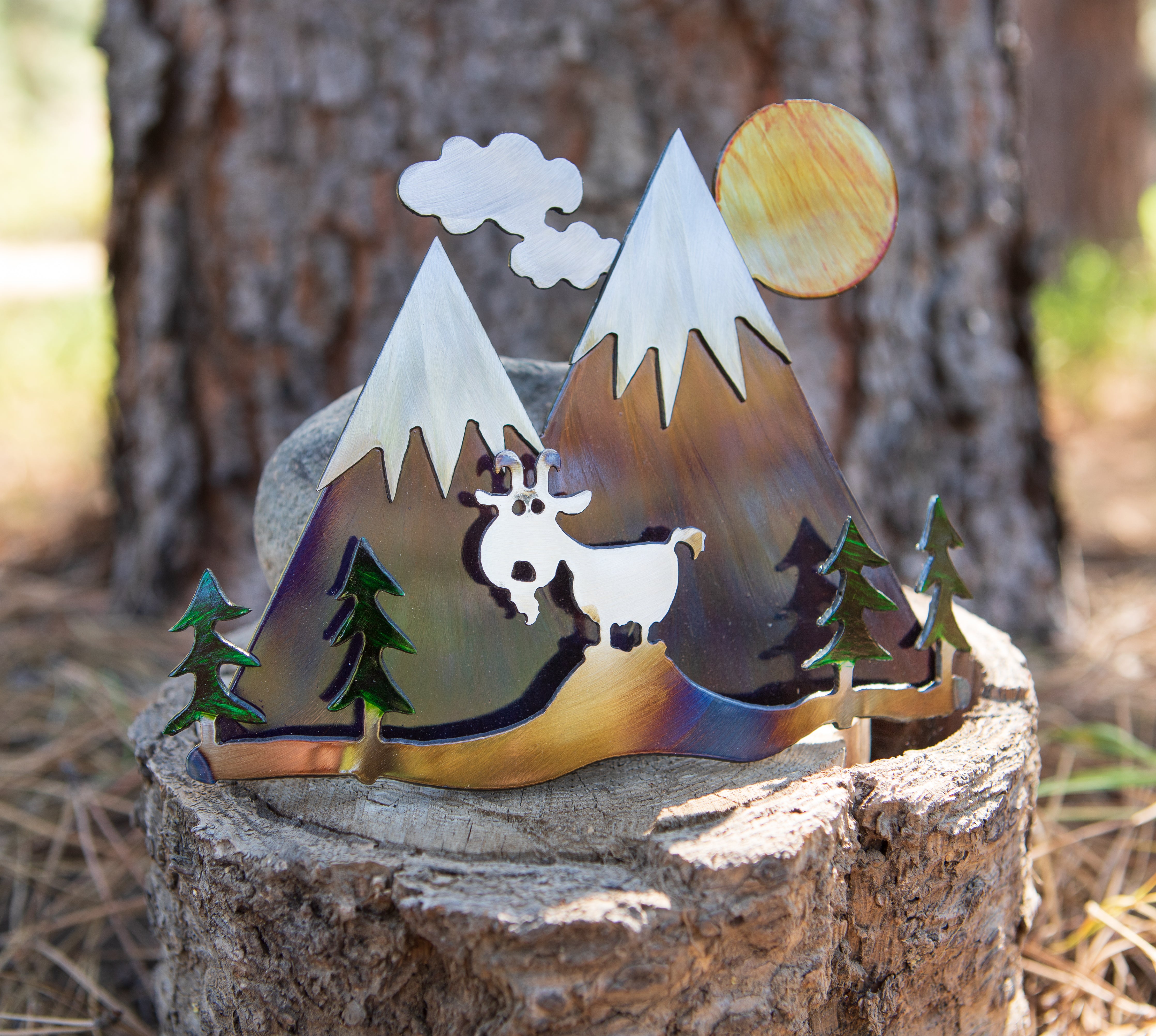 This unique metal artwork is created from layered steel, welded together to form a three-dimensional scene of a mountain goat wandering through the forest with mountains rising behind. The surface is brought to life with natural heat coloring and hand-painted details, giving each piece depth, warmth, and individuality.