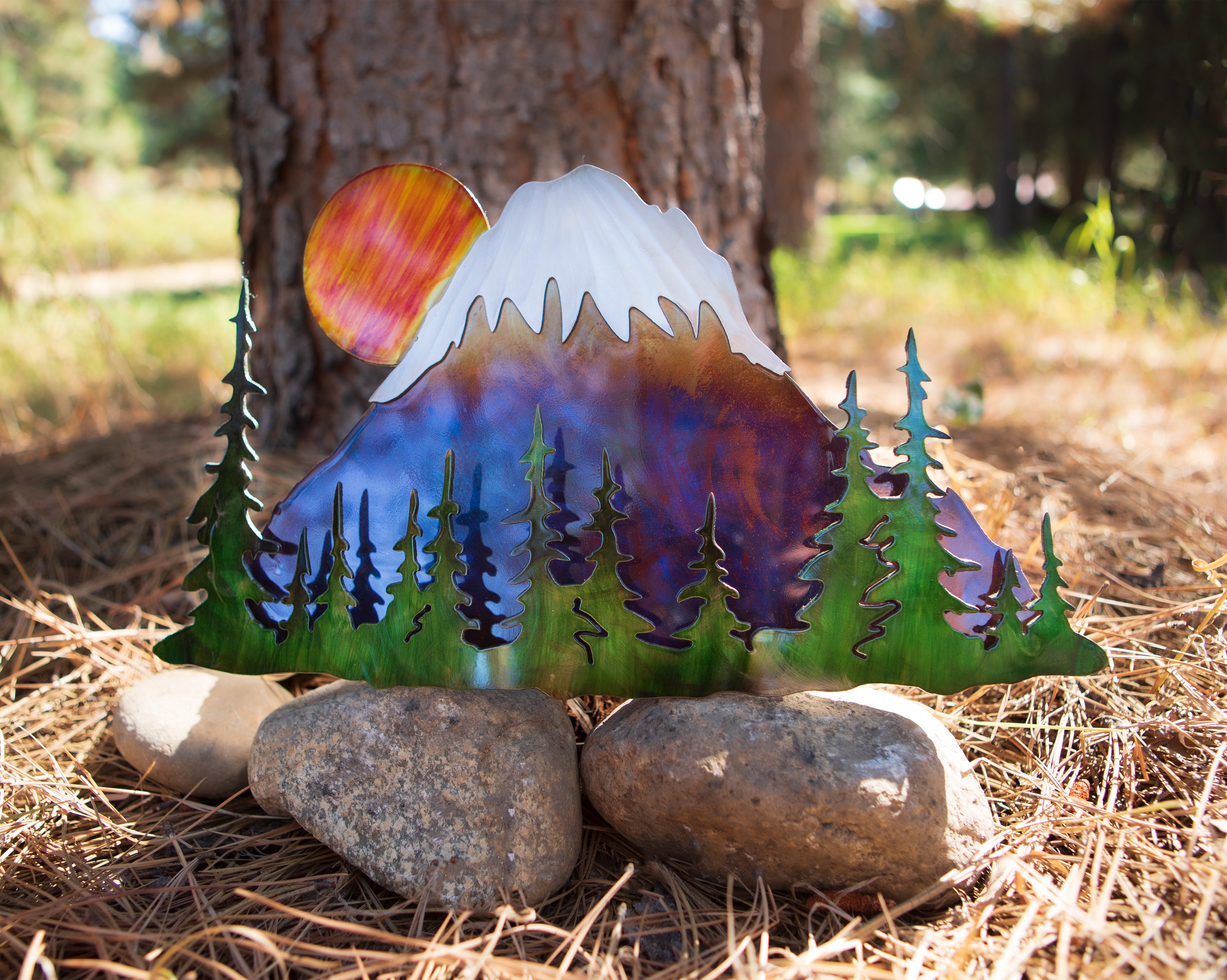 This unique metal artwork is created from layered steel, welded together to form a three-dimensional scene of Mount Rainier. The surface is brought to life with natural heat coloring and hand-painted details, giving each piece depth, warmth, and individuality.