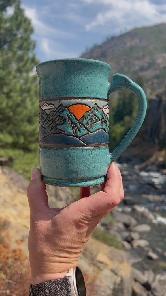 Sip your favorite beverage in style with this one-of-a-kind, handmade mug. Each mug is carefully hand-carved with original mountain-inspired artwork that wraps beautifully around the piece, making every angle a unique view. Crafted with attention to detail and love, this mug is perfect for cozy mornings, peaceful evenings, or as a thoughtful gift for nature lovers and art enthusiasts alike. Bring a touch of handmade charm and mountain serenity to your everyday routine!